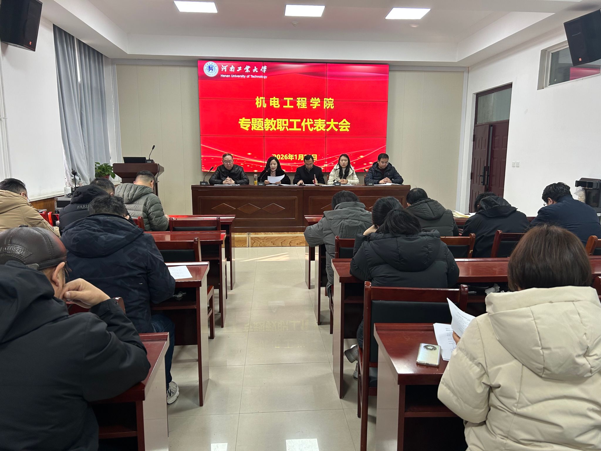 1月28日,机电工程学院在惟明楼捷赛厅召开2025年度专题教职工代表大会。学院党政领导班子成员、各系(室)教代会代表参加会议。会议由学院党委副书记、工会主席张东霞主持。