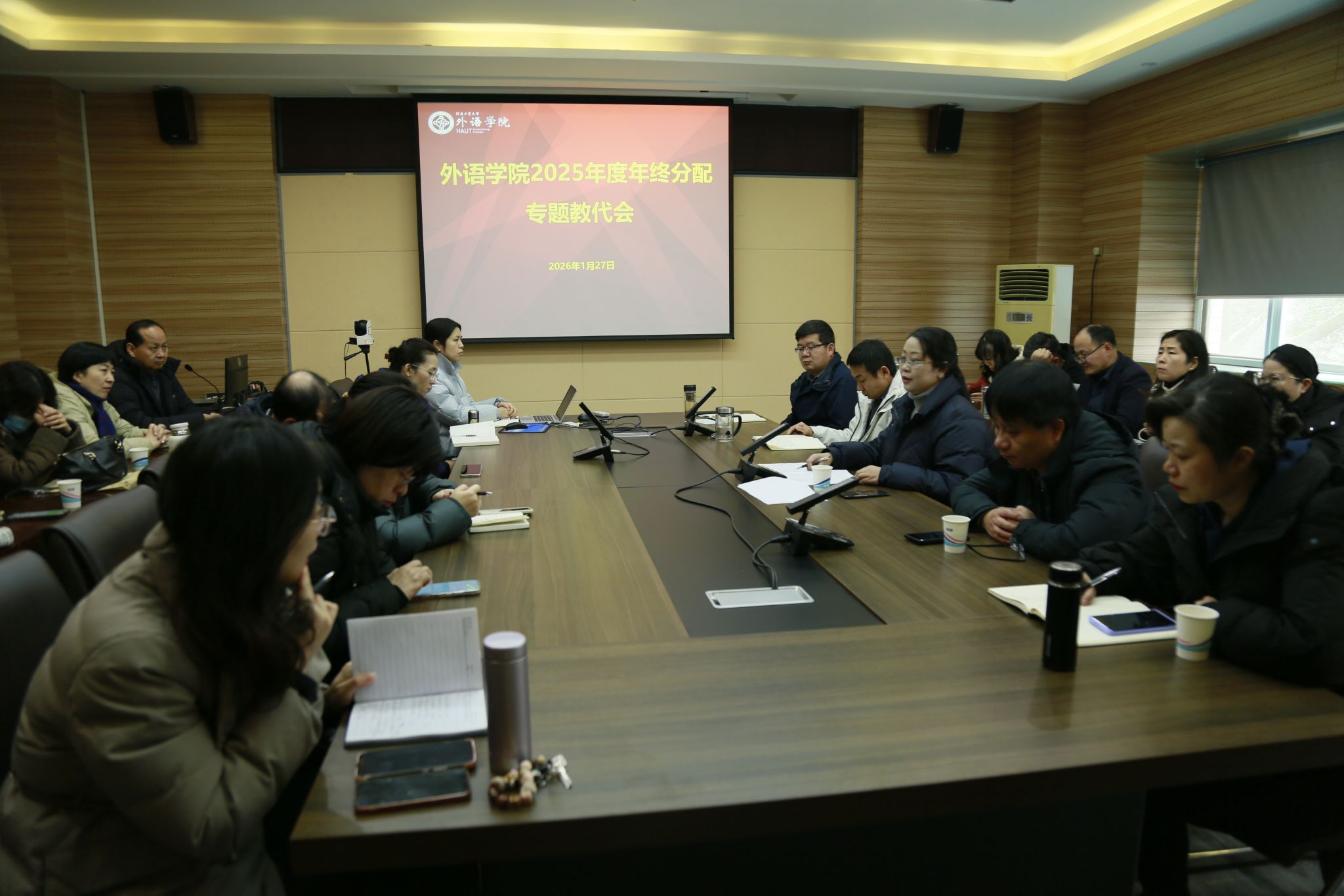 1月27日上午,外语学院在5231会议室召开2025年度年终分配专题教职工代表大会,讨论审议《外语学院2025年度奖励性绩效二次分配方案》,学院领导班子和教职工代表参会。会议由学院党委副书记、工会主席王晓东主持。