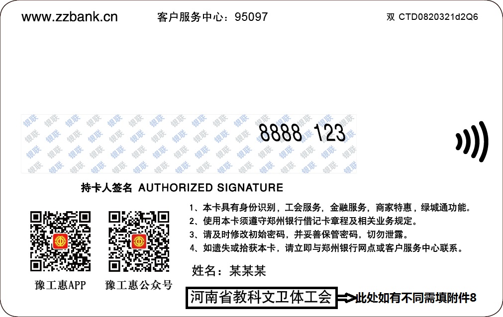 有意向参加绿色出行活动的在职会员,若之前已在郑州银行办理“河南省工会会员卡”,但会员卡背面姓名下方不是“河南省教科文卫体工会”字样(如下图),需填报已办卡会员信息表(附件8-1),填写完整之后发送至校工会邮箱gonghui@haut.edu.cn。