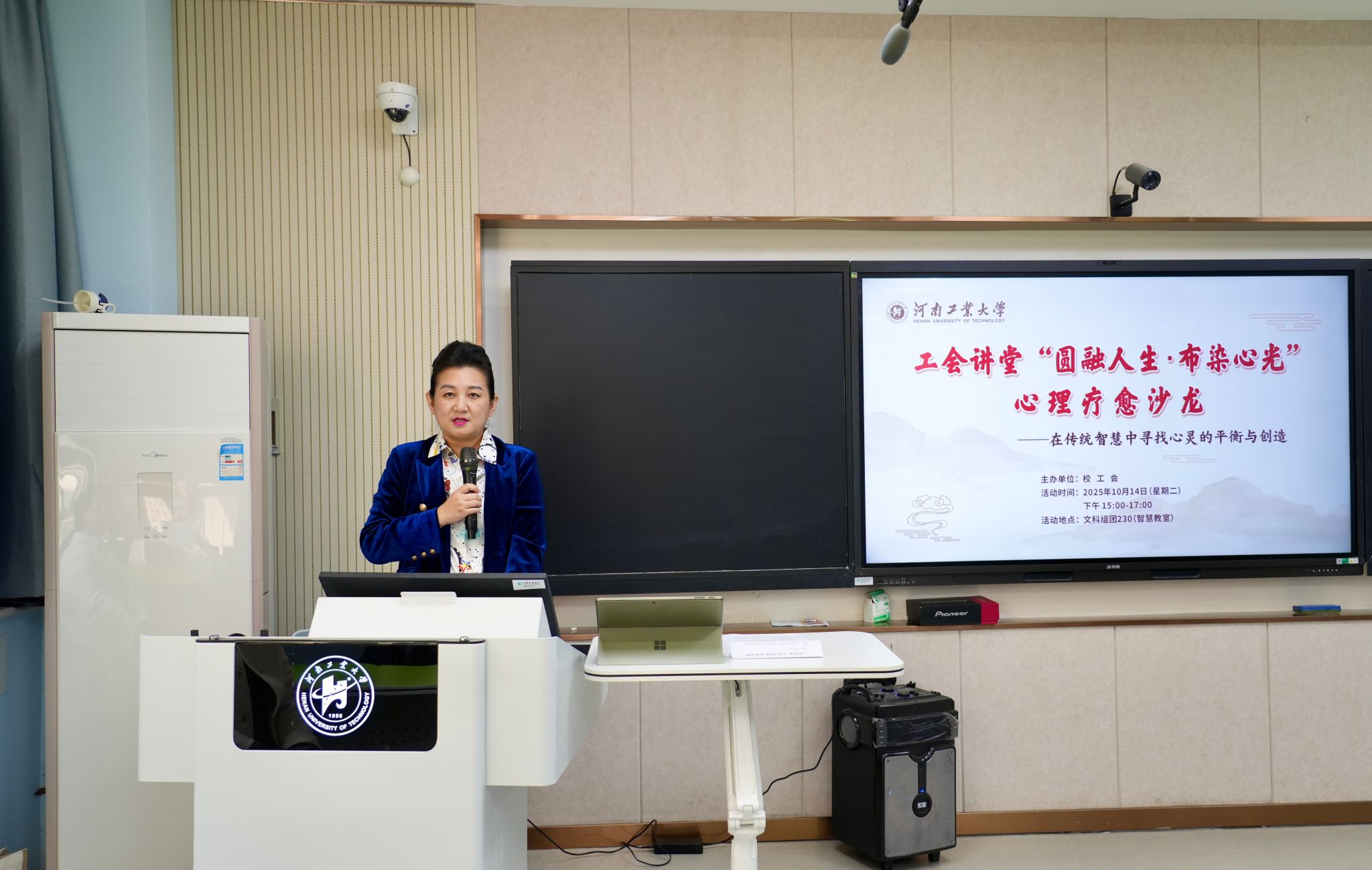 为更好地关爱我校教职工身心健康,帮助大家在繁忙的工作与生活中舒缓压力、滋养心灵,校工会于2025年10月14日下午,在文科组团230智慧教室成功举办了工会讲堂---“圆融人生,布染心光”心理疗愈沙龙。本次活动旨在将中华传统哲学智慧与现代心理疗愈方法相结合,为教职工提供一个放松身心、探索内心、表达自我的沉浸式心灵滋养平台,在传统与现代的交融中,让“心光”照亮生活,以“圆融”智慧安顿心灵。