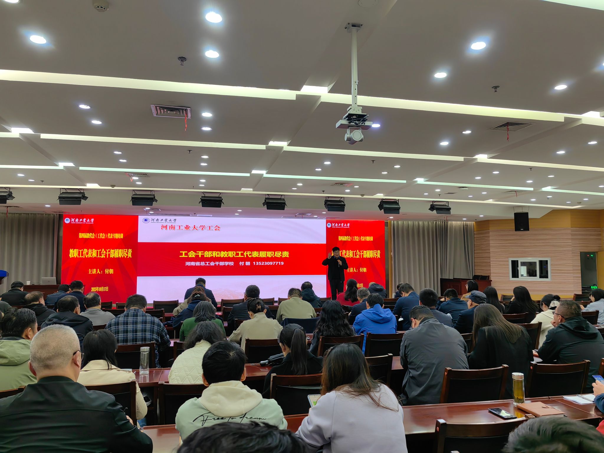 为深入学习贯彻习近平总书记关于工人阶级和工会工作的重要论述,贯彻落实中国工会十八大和河南工会十六大精神,进一步加强学校教代会(工代会)建设,不断提高代表的政策理论水平和参政议政能力10月17日下午,校工会特邀河南省总工会干部学校副教授付朝,在学术报告中心D205报告厅做了《工会干部和教职工代表如何履职》的专题培训。全校第四届教代会(工代会)正式代表180人参加培训。