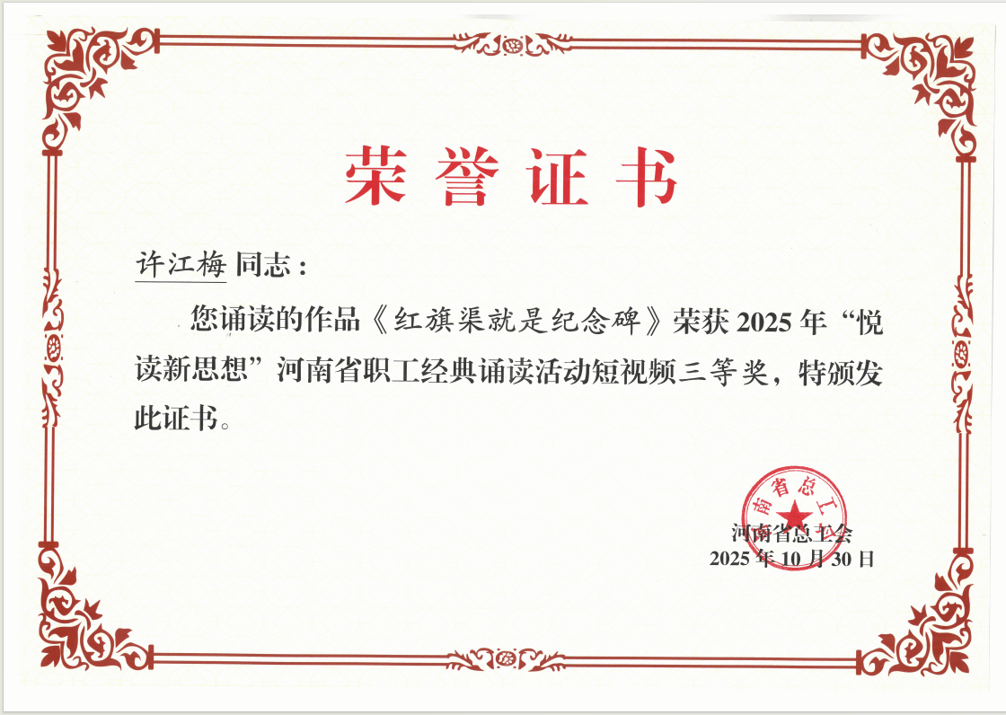 近日,河南省总工会公布2025年“悦读新思想”河南省职工经典诵读活动获奖名单,我校外语学院教师许江梅的作品《红旗渠就是纪念碑》喜获短视频组三等奖。