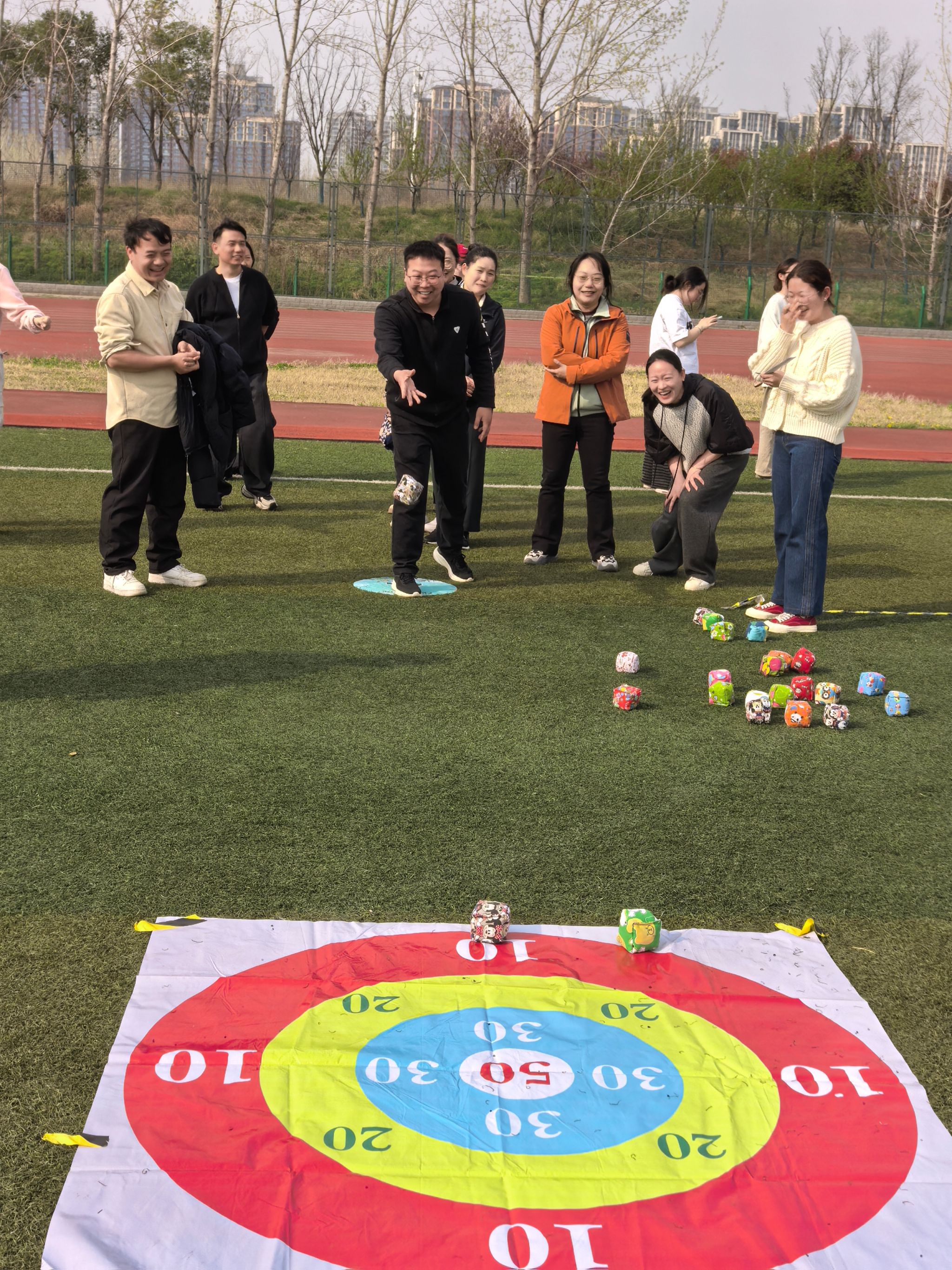 鸿运当头赛区,巨大的充气彩球在队员们的托举中飞驰向前,比的不仅是速度,更是团队的节奏与默契;车轮滚滚赛区,队员们站在环形彩带内整齐迈步,宛如“陆地龙舟”滚滚向前,加油声此起彼伏;珠行万里赛区,小球在U型槽中接力传递,每一次精准衔接都扣人心弦;投掷沙包赛区,瞄准、发力、入筐——欢呼声与掌声交织不断。参赛教职工们纷纷表示,这场运动会让大家暂时放下工作的繁忙,在欢声笑语中调适身心、增进情谊。赛场边,医护人员全程驻守保驾护航;看台前,项目轮次表与积分统计处井然有序。