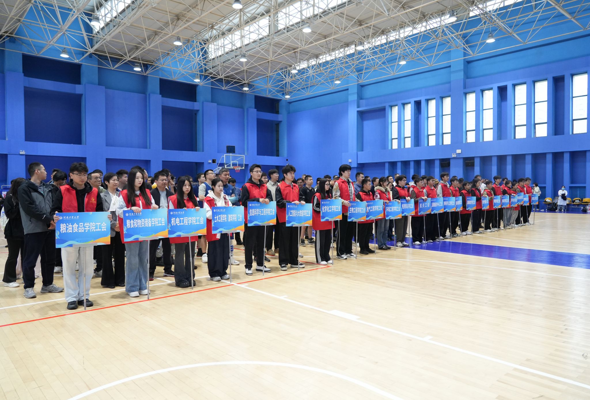 为庆祝学校建校70周年,营造浓厚校庆氛围,丰富教职工业余文体生活,4月21日下午,我校第十二届“电气杯”教职工篮球比赛开幕式在莲花街校区体育训练中心篮球馆举行。校党委副书记黄泽峰,校工会副主席宋伟,校工会副主席、女工委主任张莉,体育学院党总支书记钟月双、院长王放,电气工程学院院长王莉等领导出席开幕式。全体运动员、裁判员及工作人员近300人参加了本次活动。开幕式由教职工篮球协会会长、国际教育学院院长张浩军主持。